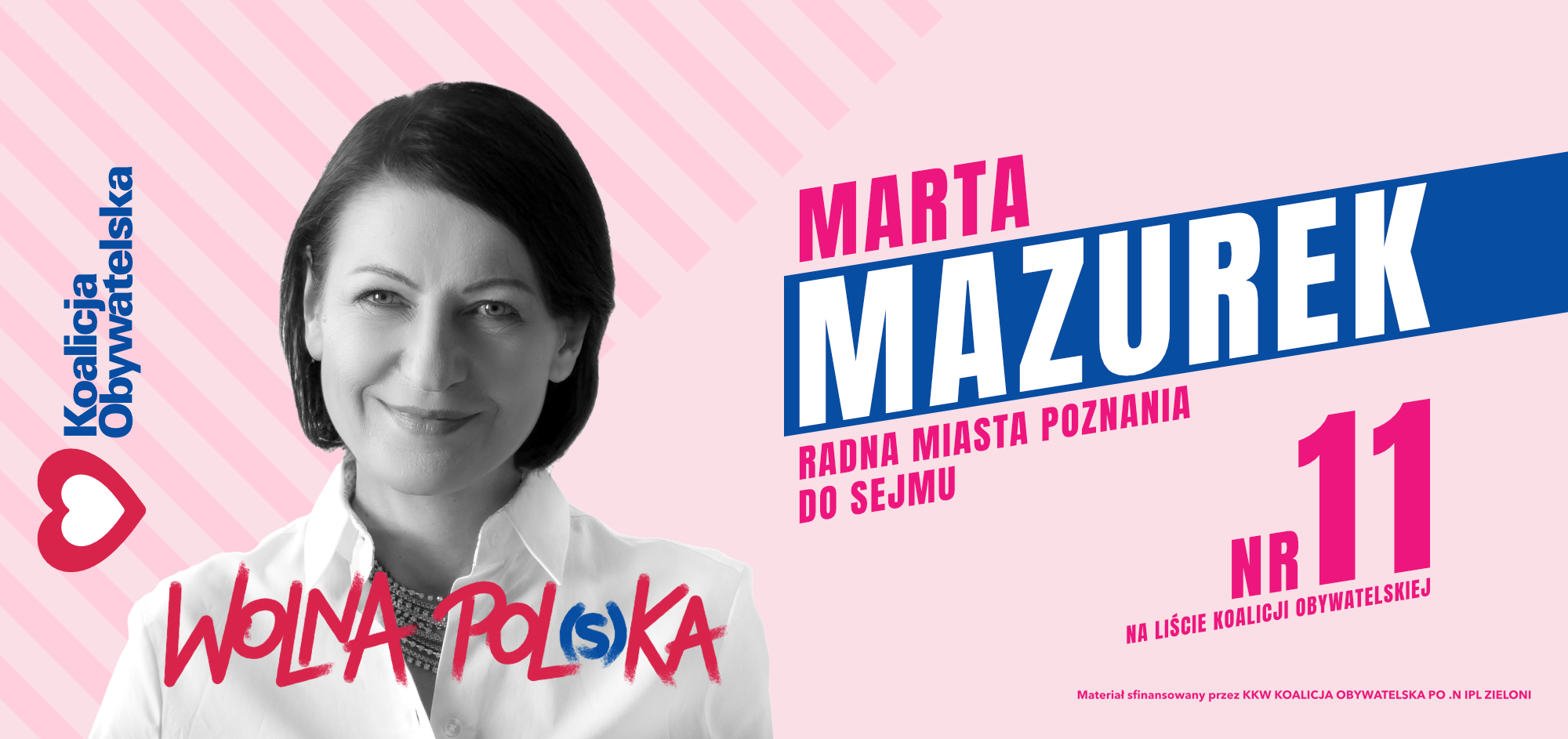 For several years, I have been actively supporting the election campaigns of Marta Mazurek – a Poznań city councilor. I participated in three campaigns: two for the Sejm (2019 and 2023) and the most recent local government campaign in 2024. In each, I was responsible for the complete visual design: creating banners, posters, leaflets, stickers, election spots, Instagram reels, and other promotional materials. Beyond graphic work, I actively participated in organizing the campaign team.